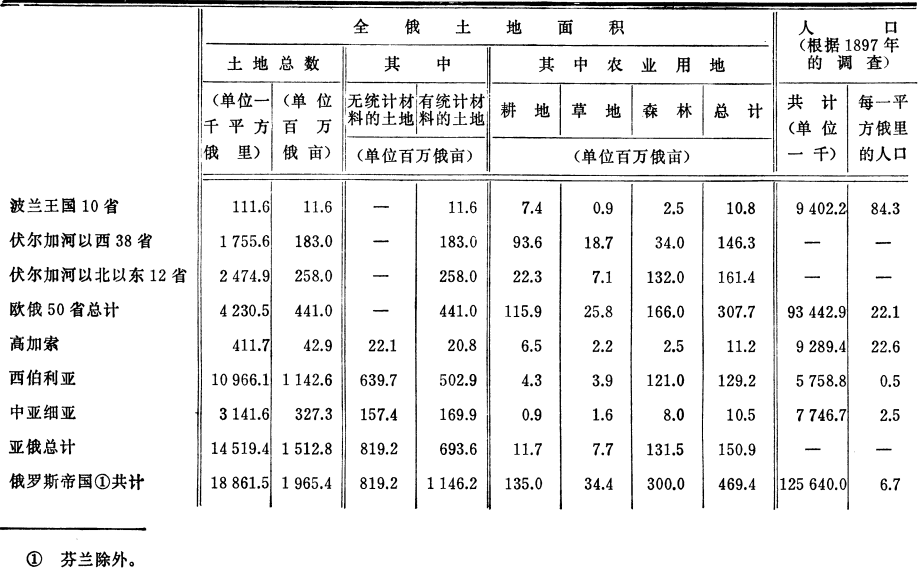 边疆地区指的什么呢?显然是指的无人居住或者人烟稀少、尚未充分用来发展农业的土地。现在我们应该从欧俄转而来谈整个俄罗斯帝国,以便对这些“边疆地区”的情况及其经济意义有一个确切的概念。