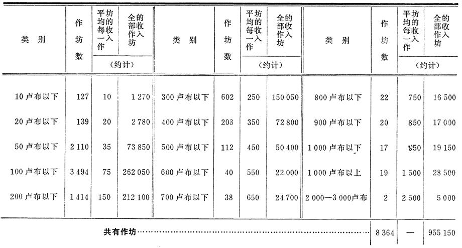 (7) 下面将引用各作坊按纯收入分类的材料。根据这些材料,在收入最低(不到50卢布)的2376个作坊中,纯收入等于77900卢布,而在收入最高的80个作坊中,纯收入等于83150卢布。每个“作坊”的纯收入平均分别为32卢布和1039卢布。