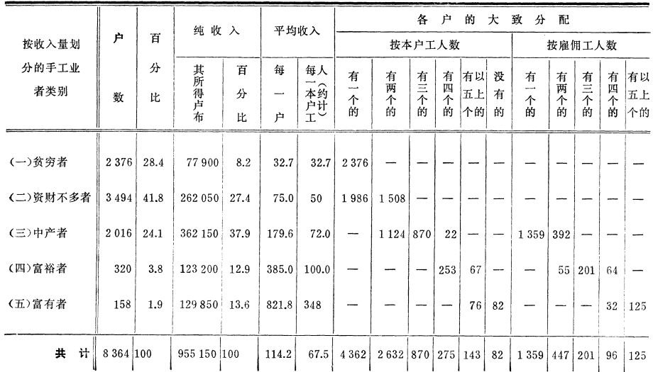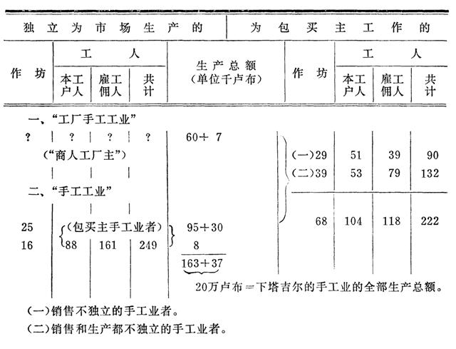(27) 花边业、五金业和手风琴业也都有这方面的材料,但我们没有引用这些行业,因为它们没有关于各作坊按本户工人数划分的材料。