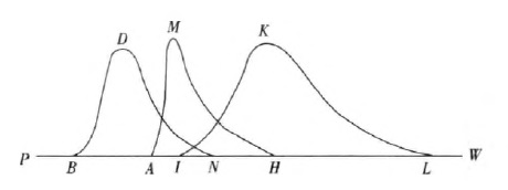 曲线BDN表示热辐射从波长最大的热射线(在B点)到波长最小的热射线(在N点)的强度变化。曲线AMH表示从波长最大的(在A点)到波长最小的(在H点)光线的强度变化。曲线IKL表示从波长最大的(在I点)到波长最小的(在L点)化学射线的强度变化。在所有这三种情形中,射线的强度都是用曲线上的点到直线PW的距离来表示的。——733。