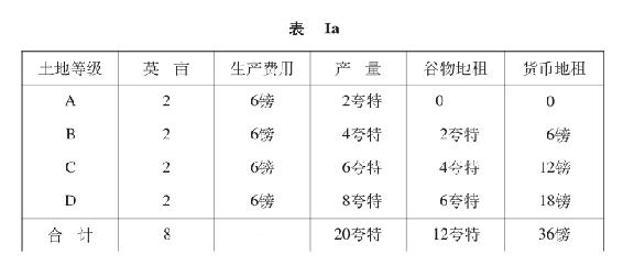 拿Ia同I比较,我们就会看到,如果四级土地的耕种面积按同一比例增加,总产量就会随着耕种的英亩数增加一倍而增加一倍,谷物地租和货币地租也会增加一倍。