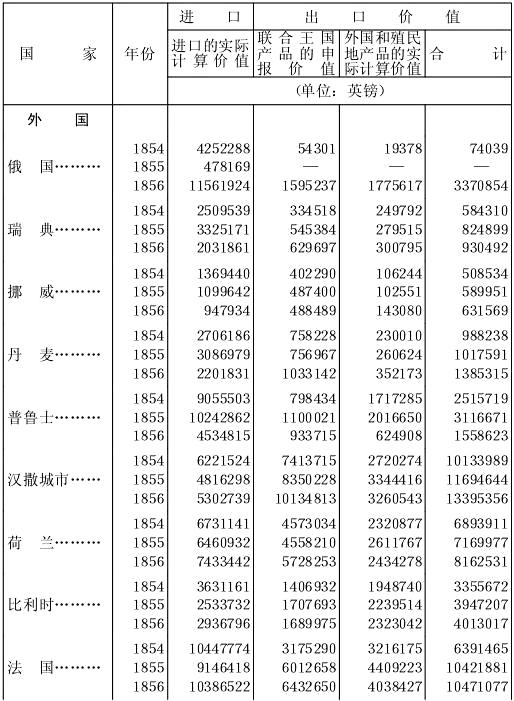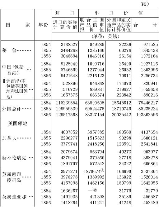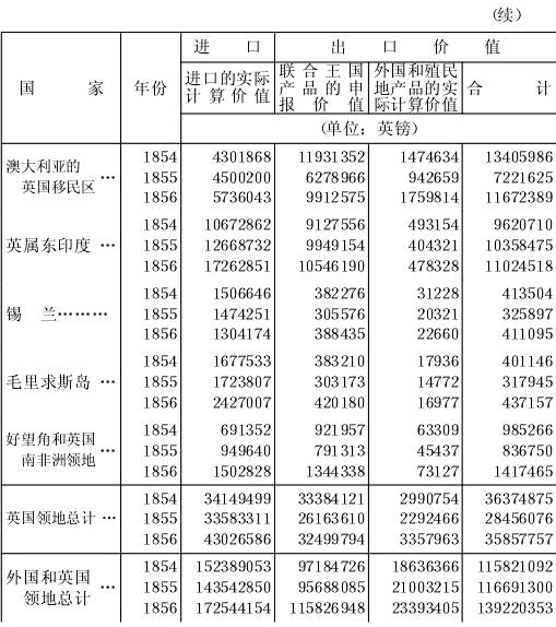 进口(单位:磅)年份 从外国 从殖民地 总计1853……………37568199 46277276 83845475 1854……………27006173 50187692 77193865 1855……………17293842 53896173 71190015 1856……………22377714 62148467 84526181 1857……………27607364 63053100 90657464 进口(单位:磅)年份 向外国 向殖民地 总计1853……………2480410 4343166 6823576 1854……………5993366 13117102 19110468 1855……………8860909 12948561 21809470 1856……………5523345 17433958 22957303 1857……………4561000 25068787 29629787 |