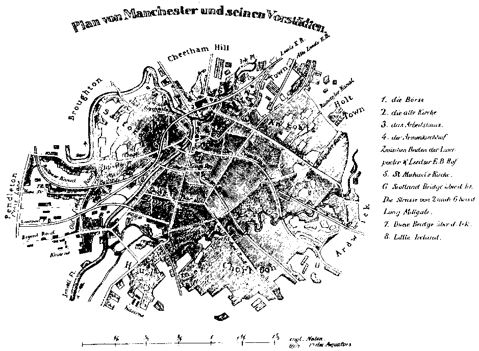 Doch genug über diese kleineren Städte. Sie haben alle ihr Apartes, aber im ganzen leben die Arbeiter in ihnen gerade wie in Manchester; darum habe ich auch nur ihre eigentümliche Bauart besonders geschildert und bemerke nur, daß alle allgemeineren Bemerkungen über den Zustand der Arbeiterwohnungen in Manchester auch auf die umliegenden Städte ihre volle Anwendung finden. Gehen wir nun zur Zentralstadt selbst über.