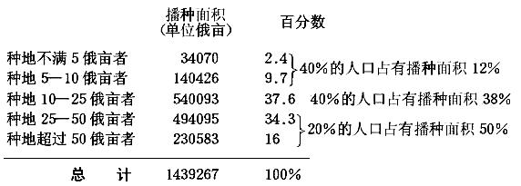 份地租地的分配情形也提供了完全相同的结论,上面已引用了这方面的数字。为了指出份地租地对不同类别的农民有什么意义,我们摘引波斯特尼柯夫著作的第4章中对这一现象的描述。