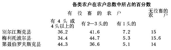 用自己牲畜耕作而不需要插犋的户主,每户有4头、5头、6头或更多的役畜(16),而他们的经济状况也有许多差别。四铧的浅耕犁需要套上4头牲畜,五铧的需要5头牲畜。耕地以后紧接着就要耙地,如果户主没有多余马匹,他就不能马上耙地,而要在耕地结束以后再耙,就是说,要用已经有些干燥的土来覆盖种子,这对种子的发芽是不利的。如果在离村很远的地方耕作,就需送水和饲料,没有多余马匹也会使工作中断。在这种种情况下,如果没有全套的役畜,就会错过时间,耽误播种。有大量役畜而又使用多铧浅耕犁时,农民能较快地播种,更好地利用有利的天气,用较湿润的泥土覆盖种子。可见春耕技术上的优越性属于每户有6头、更好是有7头役畜的‘设备完善的’户主。有7匹马时可以用一架五铧浅耕犁和两副耙同时耕作。农民们说,这样的户主‘是不会停工的’。