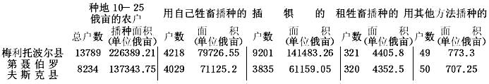 塔夫利达省的统计人员根据播种面积把农民分为六类:(1)不种地者;(2)种地不满5俄亩者;(3)种地5—10俄亩者;(4)种地10—25俄亩者;(5)种地25—50俄亩者;(6)种地超过50俄亩者。三县各类农户数目的对比情况如下: