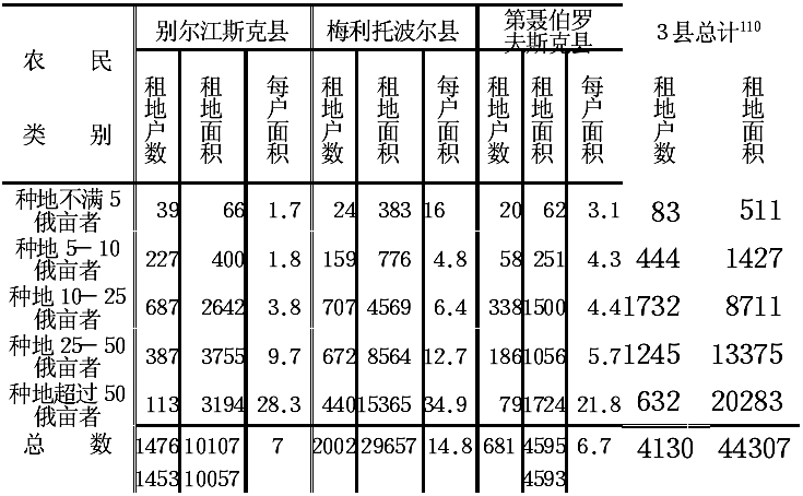 如果折算一下劳动力和播种面积的比例,我们就可得出各类农民每100俄亩播种面积分别有:
