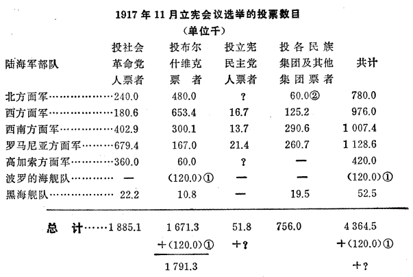 (6) ②关于究竟哪个党从黑海舰队得了19500票,并没有说明。这一栏内的其余票数,显然差不多都是投给乌克兰社会党人的,因为当选的有10个乌克兰社会党人和1个社会民主党人(即孟什维克)。