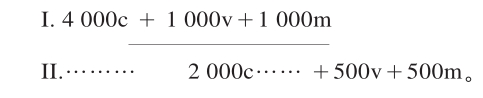 1. 第II部类工人的工资500v和资本家的剩余价值500m,必须用于消费资料。但是,它们的价值存在于价值1 000的消费资料中,这种消费资料掌握在第II部类的资本家的手里,补偿预付的500v,并代表500m。因此,第II部类的工资和剩余价值,在第II部类内部同第II部类的产品交换。这样,就有(500v+500m)II=1 000以消费资料形式从总产品中消失。