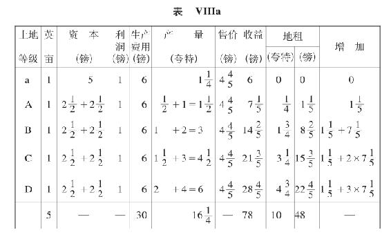 我们假定有这样一种土地(我们用a来表示)参加竞争。因此,那个一向无租的土地A也将提供地租,于是以上的表VII、表VIII和表X,将取得如下的形式: