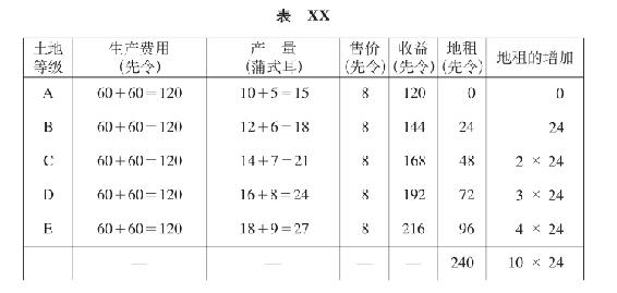 首先,把没有地租的起调节作用的土地作为零点,地租序列恰好与肥力差额序列成比例。对地租起决定作用的,不是绝对的收益,而只是收益的差额。无论各级土地每英亩分别提供1、2、3、4、5蒲式耳,还是提供11、12、13、14、15蒲式耳产品,地租在这两种情况下形成的序列,都是0、1、2、3、4蒲式耳或与此相应的货币额。