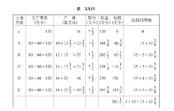 总地租下降到低于第一次投资的地租水平(表XI)的情形,只有在下述情况下才是可能的:A级土地和B级土地都退出竞争,C级土地起调节作用并且变为无租土地。