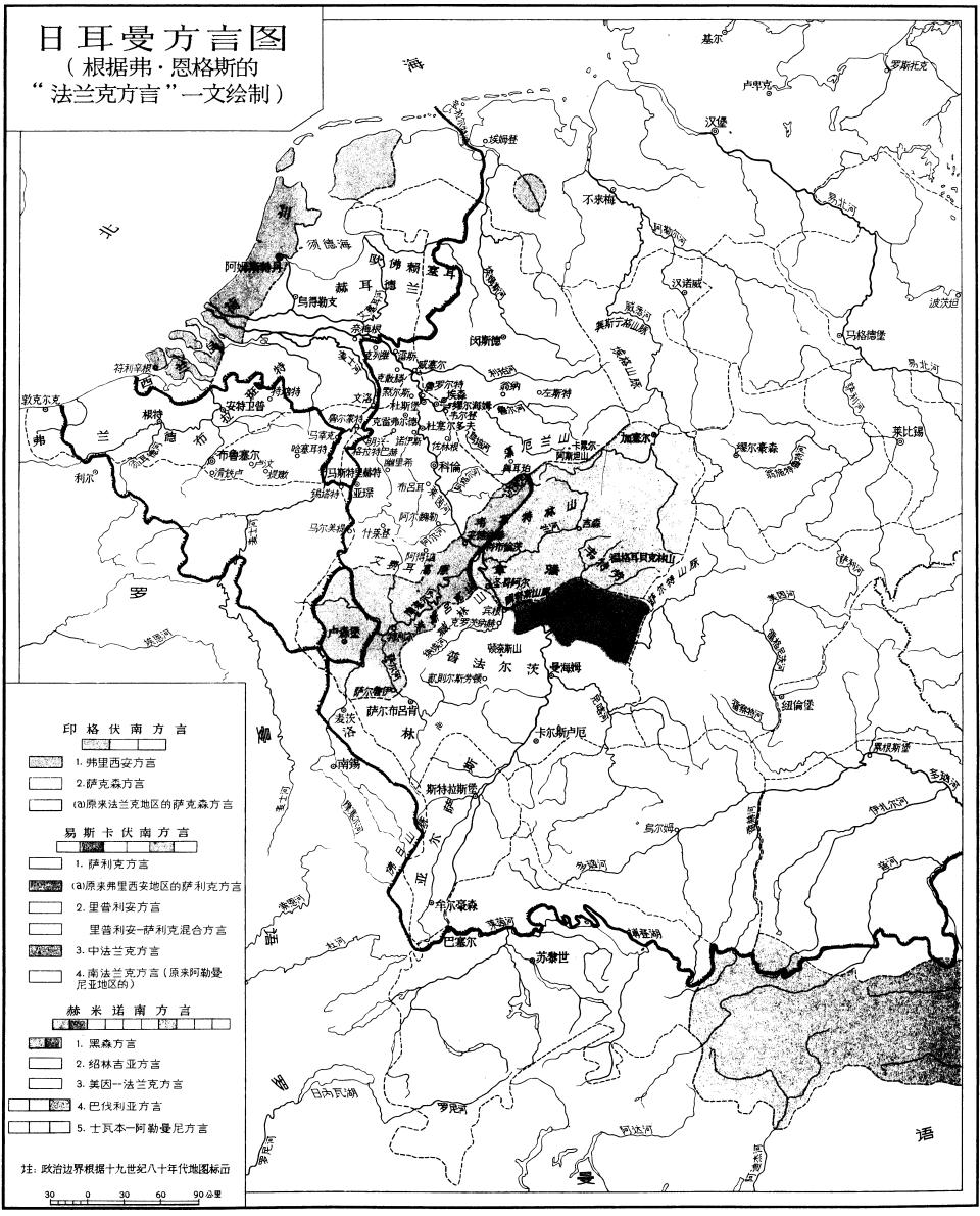 对于这种方言,语言学家们开了一个出奇的玩笑。格林认为它已经溶化在法兰西语和高地德意志语中,但新近的研究者们则认为自敦基尔欣和阿姆斯特丹起,至翁施特鲁特河、萨利河、雷察特河止,甚至一直到多瑙河,并且经过移民而直达理森山,都是法兰克方言流行的范围。甚至像库里茨·海奈那样的语文学家,竟也根据在韦尔登抄录的一篇古福音诗334手稿,编造出一种古代下法兰克语言,而这几乎是一种略带法兰克语色彩的纯粹的古代萨克森语,——而布劳涅则干脆把一切真正的下法兰克方言,一部划归萨克森语,一部划归尼德兰语335。最后,阿尔诺德是把里普利安人征服的地区,局限于阿尔和康塞尔两河分水岭以北的地方,而认为所有位于南方及西南方的地区,开头是由阿勒曼尼人占领,以后又是单独由卡滕人(他把卡滕人也划归法兰克人之中)占领的,因此,他们说的话也是阿勒曼尼―卡滕语。