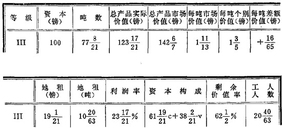但是,因为Ⅲ的每吨个别价值等于1+(3/5)镑(或8/5镑),所以Ⅲ生产[109+(1/11)]∶(8/5),即68+(2/11)吨(换句话说,这里109+(1/11)镑等于68+(2/11)吨)。其次,每吨市场价值和每吨个别价值的差额现在是2+(1/2)镑减1+(3/5)镑,或者说,2镑10先令减1镑12先令,即18先令。以68+(2/11)吨计算,就是[68+(2/11)]×18先令=1227+(3/11)先令=61+(4/11)镑。Ⅲ的产品不是卖109+(1/11)镑,而是卖170+(5/11)镑。这个余额就是Ⅲ的地租。用吨来表示,地租=24+(6/11)吨。