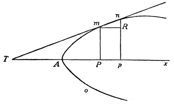 Ax是轴。我们对横座标Ax作一条垂直线mP(纵座标)。现在假设,n是曲线上无限地接近于m的一个点。如果我对轴作一条垂直线np,那末p就应该是无限地接近于P的一个点,而np就应该是无限地接近于mp的一条平行线。现在你再对np作一条无限小的垂直线mR。现在你如果假设横座标AP为x,纵座标mP为y,那末np=mP(或Rp)加一段无限小的增量[nR],或者[nR]=dy(y的微分),而mR=(Pp)=dx。既然切线的这一段mn是无限小的,所以它同曲线本身相应的部分是吻合的。因此我可以把mnR看做是△(三角形),把△mnR和△mTP看做是相似三角形。所以:dy(=nR):dx(=mR)=y(=mP):PT(它对切线Tn说来是次切线)。所以次切线PT=Уdx/dy。这就是所有的曲线的各个切点的一般的微分方程。如果我现在需要进一步解这个方程,并利用它来确定次切线PT的长度(如果后者已经有了,我只要用一条直线把T和m这两个点连接起来,就可得出切线),那末我必须知道曲线的特性是什么。按照它的性质(例如抛物线、椭圆、蔓叶线等等),它有对于每个点的纵座标和横座标的确定的一般的方程,这种方程来自代数几何学。例如,如果曲线mAo是一根抛物线,那末我就知道y2(y是每个任意一点的纵座标)=ax,在这里a是抛物线的参数,而x是相当于纵座标y的横座标。